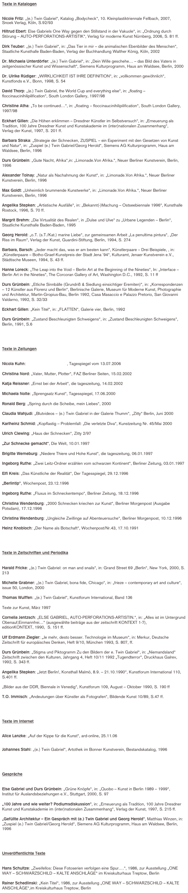 Dr. Michaela Unterdörfer: „(e.) Twin Gabriel“, in: „Dein Wille geschehe… – das Bild des Vaters in zeitgenössischer Kunst und Wissenschaft“, Siemens Kulturprogramm, Haus am Waldsee, Berlin, 2000